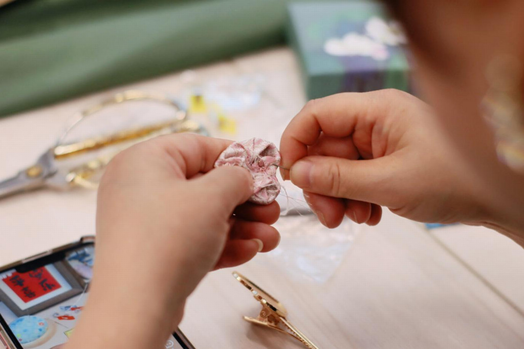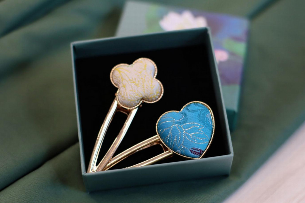 活动现场,非遗传承人结合党史学习教育中“文化自信”的内涵,以图文、实物结合的方式,向党员群众讲解宋锦的千年发展史。同时,老师还现场演示“挑花结本”的基础技法,让大家直观感受 “一寸宋锦一寸金”的工艺难度,这让在场党员群众深刻体会到传统工艺背后的“匠心”与“坚守”。在制作环节,活动创新采用“党员带头、群众互助”的模式:有手工经验的老党员主动分享针线技巧,协助年长群众固定锦片;年轻党员则帮大家整理裁剪工具,记录创作过程中的精彩瞬间。从挑选缠枝莲、云纹等宋式经典纹样锦料,到用直尺精准勾勒裁剪轮廓,再到穿针引线将锦片与发夹底座缝制贴合,最后点缀珍珠或流苏配饰,每一步都充满党群协作的温情。这枚小小的发夹,既封存了宋锦的细腻光泽,更凝结着党群同心的赤诚与力量。