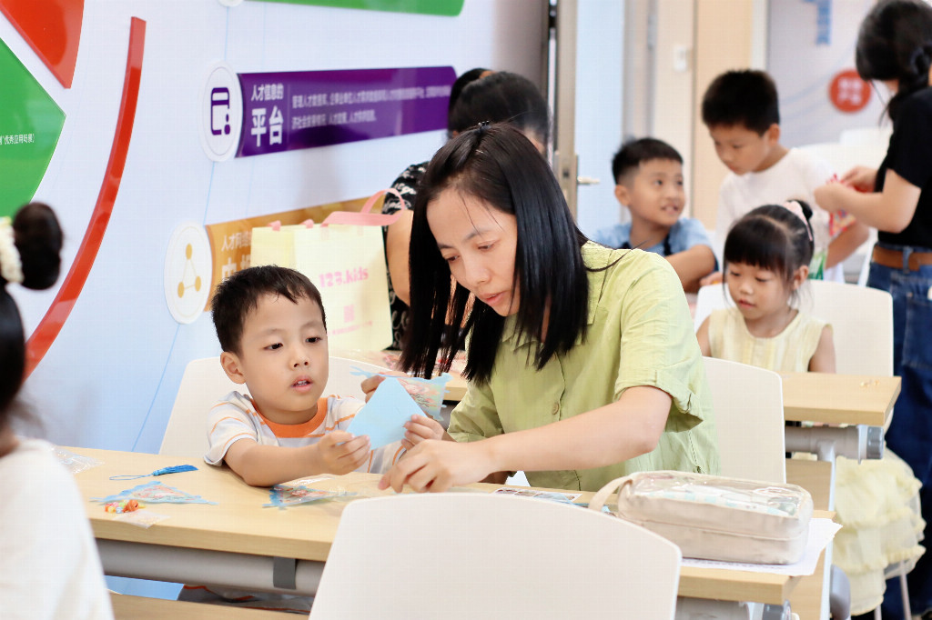 手作体验环节是本次活动的核心内容,主打制作三角国风丝带花灯。活动中,手工老师从彩纸塑形、折角固定的基础步骤教起,重点指导大家如何将绸缎丝带巧妙穿插、缠绕,打造出层次丰富的国风纹路,再一步步完成贴花、缀流苏、装灯串等全套工序。不少家庭选择亲子协作,孩子们充分发挥创意:有的在灯面点缀小巧的丝带蝴蝶结,有的用彩笔添画专属图案,让每一盏三角花灯都承载起独特的情感。为进一步丰富手作体验,党群服务中心还为参与者准备了烫金贴纸、珍珠装饰等创意工具,让每一盏三角国风丝带花灯都成为独一无二的 “情感载体”。同时,每位参与者还领到了定制款中秋钥匙扣 —— 金属材质的钥匙扣上刻有“鸬鸟中秋”字样,搭配着小巧的月亮与桂花吊坠,精致的设计让这份纪念深受大家喜爱。