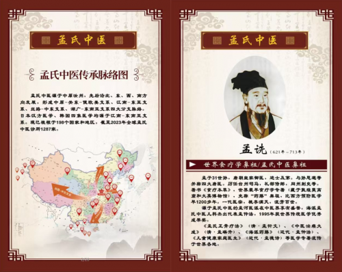 孟氏中医源于唐代四大名医之一——孟诜(621年-713年),孟子第31世孙,进士及第,曾任台州司马、同州刺史等职。作为唐朝御医,孟诜著《食疗本草》,是世界上现存最早的食疗学专著,奠定了“食医同源”的理论基础。孟诜提出的“多以食疗治未病,少以药疗治已病”的学术思想,流芳百世,成为孟氏中医后辈之祖训。千余年来,孟氏中医薪火相传,至今已在全球198个国家和地区扎根,全球孟氏中医机构达1200余家,惠及人类健康。
