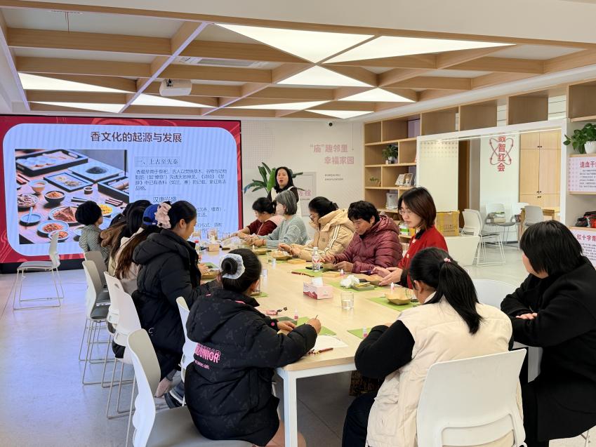 冬日午后,一缕暖阳透过玻璃窗洒在朱庙未来社区的二楼。数十位社区居民正围坐一堂,全神贯注地揉捏着手中的香泥,空气中弥漫着沉香、檀香与中草药的独特芬芳。1月10日下午,“御寒香方:手作一枚冬日暖香牌”非遗手工香牌制作活动在这里温情上演,为社区增添了别样的文化温度与邻里温情。