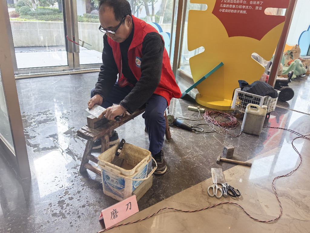 活动现场,各项服务有序铺开。磨刀服务点前排起了小队伍,居民们拿着家中用钝的刀具前来打磨;理发区的志愿者手法娴熟为居民免费理发;缝补服务也很受欢迎,志愿者们细心缝补着衣物上的小破损。